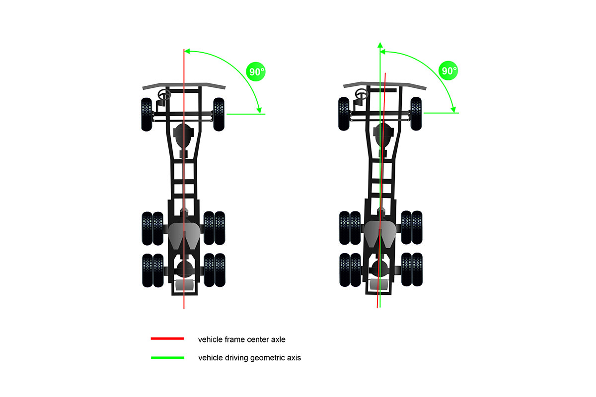 Prie rėmo tvirtinamos ašys ir ratai. Važiuoklės sistemos geometrija turi tiesioginės įtakos vairuojamų transporto priemonių saugumui, taip pat ir ekonomiškam eksploatavimui. Lygiai tas pats galioja ir komercinių transporto priemonių atveju, o galimas ekonominis aspektas yra dar svarbesnis, nes jis susijęs su padangų, degalų ir pakabos komponentų kaina. Be to, šių transporto priemonių atveju klausimas dažnai tampa dar sudėtingesnis, nes jos būna daugiaašės. Važiuoklės geometrija – tai kampinių dydžių sąveikos rinkinys, apibūdinantis visų transporto priemonės ratų išsidėstymą ir jų tarpusavio padėtį. Parametrai, susiję su ratų padėtimi, matuojami plokštumos, ant kurios stovi transporto priemonė, atžvilgiu (ratų išvirtimas), ir vairavimo sistemos komponentų atžvilgiu (kasteris ir suvedimas). Matavimai taip pat susiję ir su posūkio kampais. Matuojant varančiųjų ratų padėtį, nustatoma geometrinė judėjimo kryptis, todėl vėliau galima išmatuoti ašių nuokrypius ir teisingai jas suderinti.